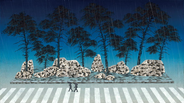 葉仁焜 下雨的時候 水墨、膠彩、銀箔、畫布、絹 90×160cm 2020