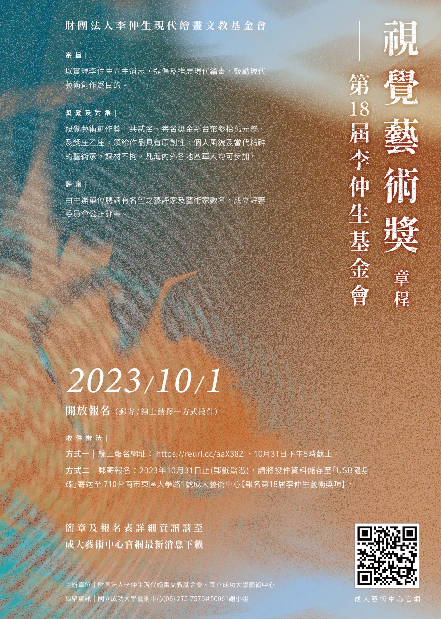 至10月31日下午5時截止;郵寄報名請將投件資料儲存至USB隨身碟,寄送至710台南市東區大學路1號成大藝術中心【報名第18屆李仲生藝術獎項】,10月31日止,以郵戳為憑。簡章及報名表詳細資訊請至