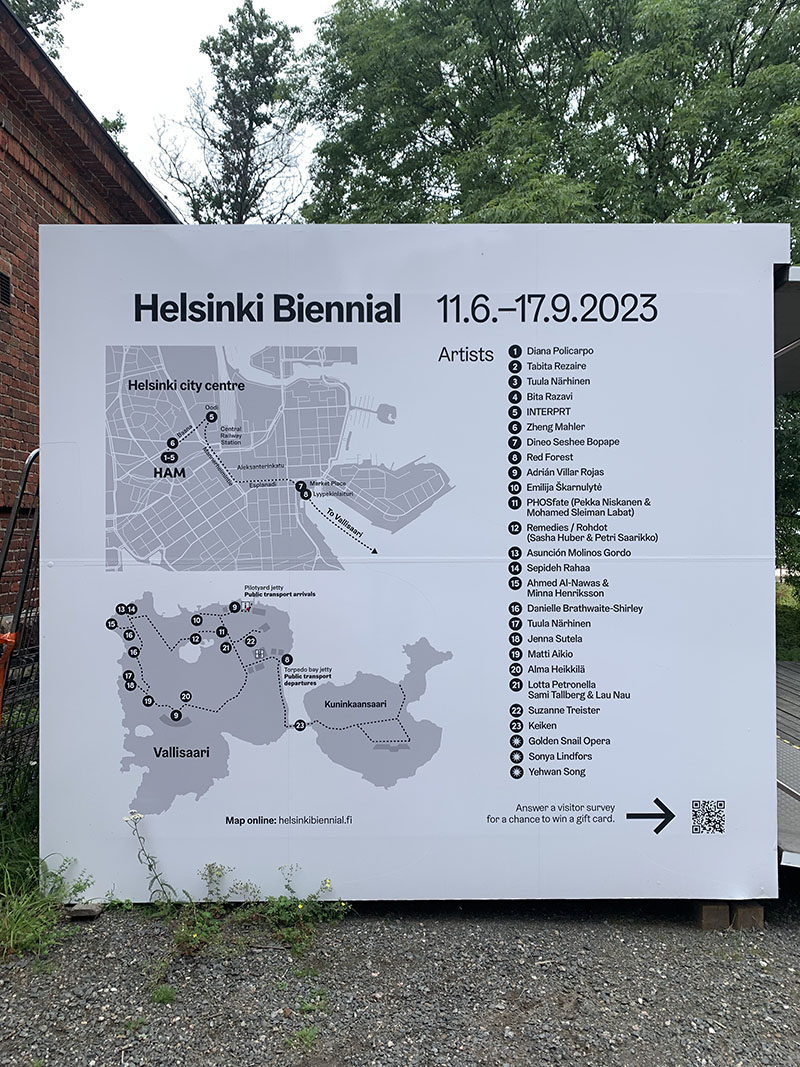 第一屆赫爾辛基雙年展於全球新冠肺炎疫情期間的2021年揭幕,是芬蘭歷史上首次舉辦的國際雙年展。本次第二屆赫爾辛基雙年展由英國利物浦約翰.摩爾大學(Liverpool John Moores University)藝術與設計學院教授喬西亞.克里沙(Joasia Krysa)統籌,長期關注藝術與科技議題的她,以「可能浮現的新方向」為主題,提出感染、再生、能動性三大軸線。赫爾辛基雙年展自創立以來致力推動自然環境、生態永續等相關議題的思考與實踐,期提昇公眾對此的意識及反思,一直是該雙年展的核心價值(參閱《藝術家》554期)。這樣的理念延伸到展覽而衍生的特點之一,便是將藝術創作展示在赫爾辛基的城市、海濱和島嶼,使參觀者能夠欣賞藝術作品的同時置身舒心的自然景色之中,期待觀者在與藝術創作和地理景觀相遇的進程中體察自身與自然的關係。