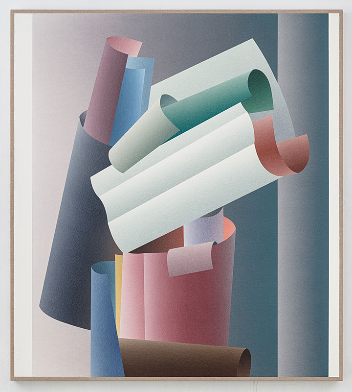 我將紙張傾斜,運用水流的動力帶動顏料——顏料又分為容易與不易沉澱者,就像河床中有大、小不一的石頭,小石頭容易因著水流往前移動,大顆的石頭則相較容易停留——顏料於紙面流動,紙面前端與後端成色的沉澱率會產生差異。完成理想中的漸層後,我再將紙張裁切、拼接成事先在電腦上設計好的樣態。此時的拼接又是另一項技術性的挑戰,畫面中具韻律感、看似堆疊的紙捲,其實是上色後的不同紙張在同一平面拼貼而來的成果。而在上色到拼接的過程中,紙張都處於濕的狀態,在濕的狀態拼接,就得找到方法處理「縮率」問題,我透過精算把空間讓出,使紙張在乾去、收縮後仍不顯露縫隙。我很享受手作的樂趣,加上本身性格比較嚴謹,目前發展出來的成果讓我很滿意,也符合我所認識的我自身的形象,我想,這也許也是吸引我繼續探索這系列、不再進行先前其他系列的原因。