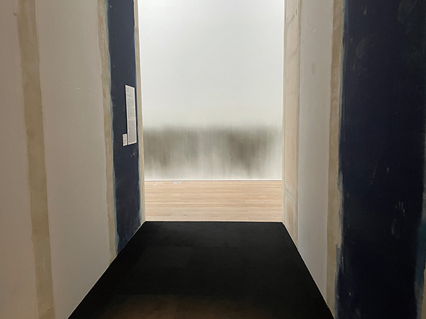 「我們的生態:生活在地球」展場設計實踐著重環保,重複使用舊展牆和牆板。中間作品為丹尼爾.特納使用化學品油輪的銅製氣壓計在美術館牆上刻畫〈壁面雕刻〉。