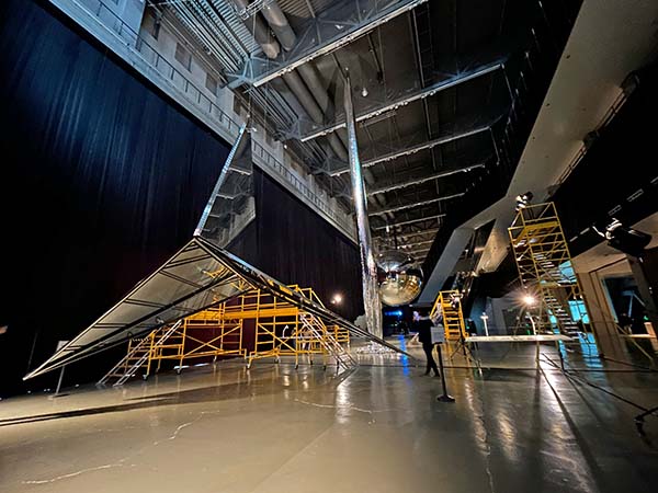 掀開黑色天鵝絨布幕進入的是一個被抹去邊界、黑暗簇擁的場域,幽暗空間讓人的感知變得敏銳,但也不由自主地失去對宇宙時空邊際的辨別。三件大型反光雕塑與黃色工作架赫然眼前,這是特雷佛.培格蘭(Trevor Paglen)的作品,伴隨著各種研究文獻和手稿展出,看似科幻片中人造衛星製造場景。這些物件不是征服星辰大海的太空飛行物,也沒有衛星傳送訊息的功能,在光線暈染下,簡約的幾何形體光面映照著觀眾的身影和凝視它的視線,彷彿宇宙回視人類的目光,而這一切也許已如施慧〈物殤〉隨著時代更迭成為遺跡,令人恍然。