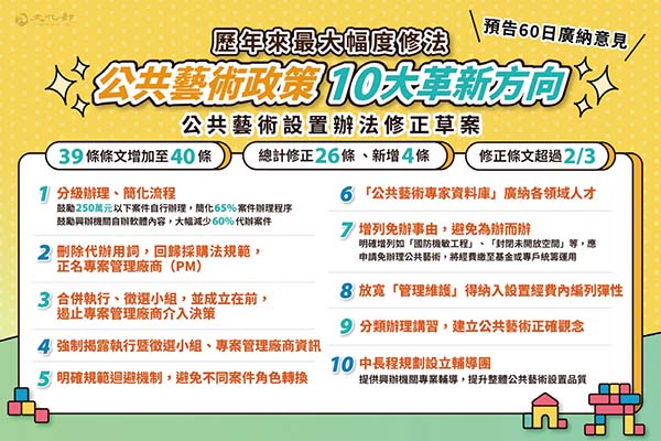 文化部推出公共藝術十大改革方案,並具體落實於「公共藝術設置辦法修正草案」,包含:「分級辦理、簡化流程」、「刪除代辦用詞,回歸採購法規範,正名專案管理廠商」、「合併執行、徵選小組,並成立於前」、「強制揭露執行暨徵選小組、專案管理廠商資訊」、「明確規範迴避機制」、「公共藝術專家資料庫廣納各領域人才」、「增列免辦事由」、「放寬管理維護得納入設置經費內編列彈性」、「分類辦理講習」、「中長程規畫設立輔導團」。文化部強調除十大革新方向及修正子法「公共藝術設置辦法草案」,有關涉及《文化藝術獎助及促進條例》中包含公共藝術設置經費金額等母法修正以及其他相關建議,將持續聽取各界意見並進行研議。