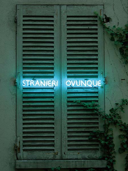 第六十屆威尼斯雙年展的展題「處處都是外人」(Foreigners Everywhere),取自巴黎出生、現居巴勒摩的藝術雙人組克萊兒.方丹(Claire Fontaine)自2004年開始發展的同名系列作品。該系列作品由不同顏色的霓虹燈管組成,形塑出以各種語言表達的「處處都是外人」字樣,時至今日,作品數量仍在持續增加。而「處處都是外人」這一字句,又來自2000年代早期在義大利致力於對抗種族主義與仇外心理(xenophobia)的杜林藝術團體「Stranieri Ovunque」(譯者註:中譯即為「處處都是外人」)。目前在克萊兒.方丹這系列的霓虹燈管雕塑中,已經累積了約五十三種語言,西方與非西方語言都有,其中包括幾種原住民族語言;事實上,有些語言如今也已經絕跡了。在今年雙年展中,這系列作品將轉化為全新的大型雕塑,於極富象徵性的軍火庫船塢區(Gaggiandre)展出。