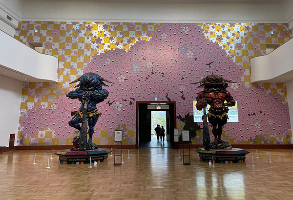 正逢櫻花季即將大爆發的春天,展場入口處左右各佇立著基座腳震眾邪鬼、手拄狼牙棒的巨型黑色阿像與紅色吽像,善於擷取文化符號的村上隆以櫻花鋪滿阿、吽二像背後的整大面牆,每朵櫻花都是裂嘴大笑的花人,迎面就以絕對催逼的視覺感受,正如以村上隆為主的雜誌特刊所下的註腳:「最新的村上世界以絕對的壓倒性氣勢與京都對峙」。