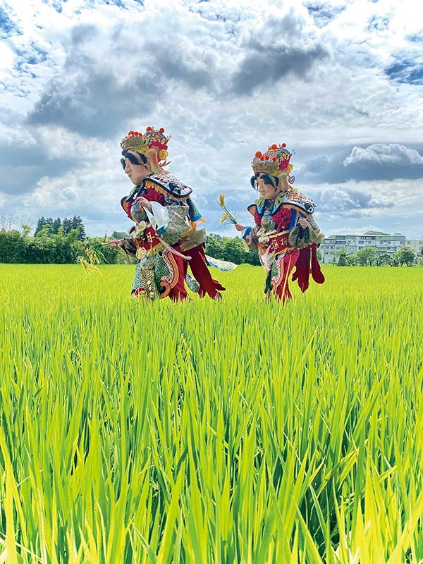 答:最近完成、現於龍潭大廟龍元宮的一對小仙童是神農的駕前仙童。民間信仰在台灣有400年歷史,如果能賦予祂近代意義,那便是作為台灣特有種生物的守護神。我在小仙童身上堆疊許多龍潭當地的特有種,包括台灣萍蓬草、龍潭莕菜等元素。