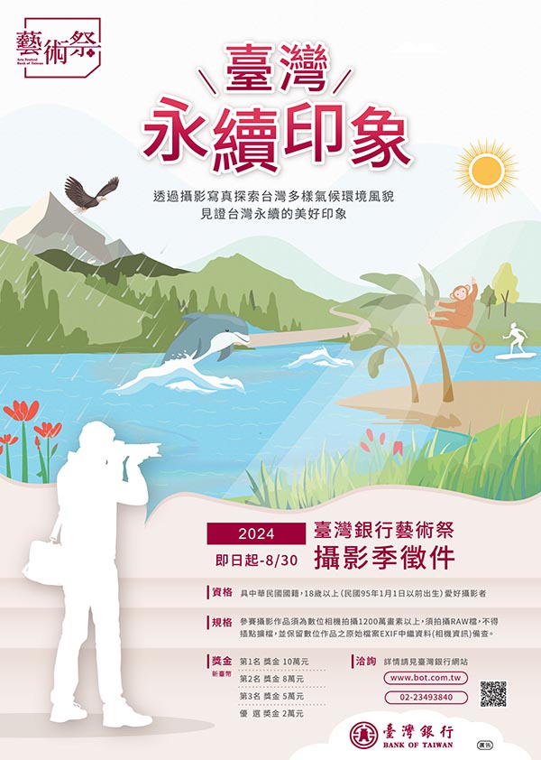 「2024臺灣銀行藝術祭-攝影季」攝影比賽徵件活動,自即日起至2024年8月30日止,凡具中華民國國籍且年滿18歲,於2006年1月1日以前出生之愛好攝影者,即可報名參賽。該行號召全台所有的攝影愛好者以「臺灣永續印象」為攝影創作主題,一起關注氣候的轉變。每一組參賽應送3張攝影作品參賽,作品應具相關性、故事性或主題性,參賽作品須為2023年以後拍攝之原創作品,且未於任何競賽中得獎、入選或公開發表過,並附上一百字以內的創作說明。