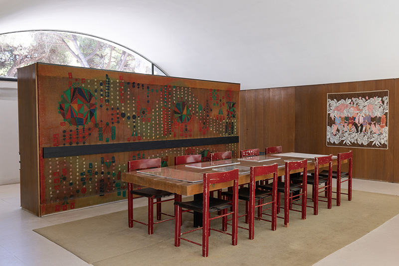 格米斯之家屋內空間寬敞簡潔,最令人驚喜的是展場新舊並陳的呈現方式。在這觀眾可以欣賞到加泰隆尼亞藝術家瑪格達.布露瑪.切爾多(Magda Bolumar Chertó)與菲娜.米拉萊斯(Fina Miralles)1960年代到1970年代的作品。這些作品設於屋內餐廳和起居室中,其中〈獻給里卡達的黃麻織品〉更是格米斯之家原始裝潢的一部分;此作是無形式藝術家(Art Informel)布露瑪.切爾多為格米斯之家(又稱里卡達〔LaRicarda〕)創作的掛毯,布面紅綠相間的斑點、線條以及跳動的幾何造形,靈感源自格米斯之家日常的音樂聚會。「身體與自然元素的關係,被稻草覆蓋的身軀」是一系列黑白攝影,由米拉萊斯創作於1975年,藝術家將自己用一層層稻草包裹,逐漸隱沒於自然景觀中,映射出藝術家物我一體的宇宙觀。