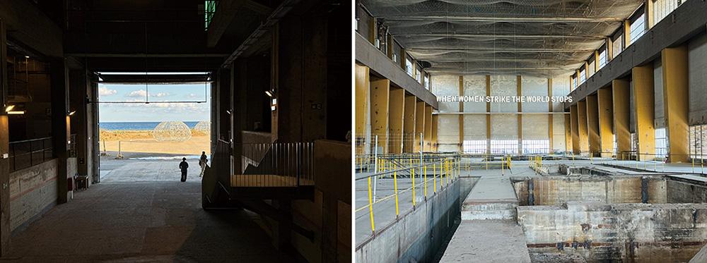 時間回溯到1960年代,當時有上千位女性工人走上街頭,呼籲政府設立新的工廠,以減少熱力發電廠帶來的空氣汙染與疾病,三根煙囪於焉誕生。這段歷史促使女性主義藝術團體克萊兒.方丹(Claire Fontaine)在煙囪內展出〈當女性抗爭時,全世界都靜止了〉;亮晃晃的幾個霓虹燈管大字佔據煙囪頂樓最高的空間,伴隨遠方傳來的風嘯聲、海岸的浪濤聲、廠房低頻的噪音,縱使時間流轉,工廠生產活動停擺,仍要提醒世人勿忘女性在公民環境運動中的關鍵角色。(全文閱讀594期藝術家雜誌)