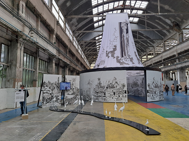 法國藝術家芻魯克.芮齊(Chourouk Hriech)是一位素描創作者,火車大廠一館入口正對面的建築外牆壁畫即是由她的作品呈現,黑白素描布滿了整個牆面。她特別喜歡畫天空與鳥類,尤其是候鳥藉由遷徙打破不同的國界。此外,芮齊在展場中裝置一件巨大的帳篷,周圍畫滿素描,帳篷裡面氣氛安祥。她希望能夠提供觀眾一個與大自然和平相處的空間,也期待在人際關係中解除對立,進一步獲得和解。