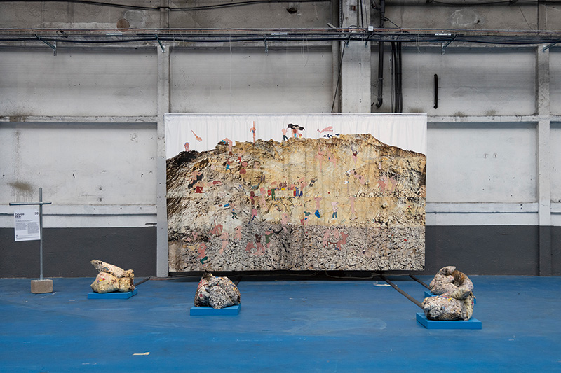 土耳其藝術家戈茲德.伊爾金(Gözde Ilkin)的裝置作品〈多數的口音〉靈感來自讓─保羅(Jean-Paul)和維維安(Viviane)等八位曾在不同年分於火車大廠工作的員工回憶:關於這個工作空間、他們的工作點滴,以及員工間的互相團結、爭取員工權益的抗爭行動。他們見證了火車大廠廠房的轉型,這裡透過集體的努力成就不同人物、語言、口音和地理的交匯點。工人離開後,被棄置的廠區中,植物、石頭佔據了鐵軌,並與工人們的生產和抗爭故事交織在一起。她在印花布料上以刺繡呈現人類、動物和植物的混合圖案,以及工人們為爭取權益而發起抗爭遊行的標語、符號,這些是屬於火車大廠記憶的圖案。刺繡作品前端的填充布料物做成的記憶石隱藏著音響,組成了聲音空間的主要部分,觀眾可以在此聆聽參與者的敘述與分享。(全文閱讀594期藝術家雜誌)