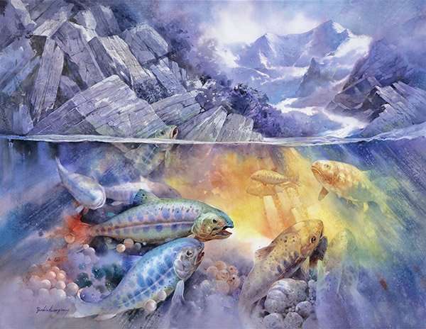 作者描寫大自然的變奏,透過水中魚群不斷產卵求生,隱喻生命對環境變遷的對抗。生命之光重生希望,在水彩暈染漸層的技法展現成熟,讓畫面產生豐富的色調變化,是非常精彩的作品。