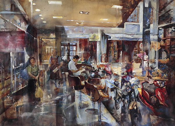 廊下擁擠的機車搭配閒適的室內空間,形成了穿透的視覺意象,透過線條與室內桌椅和室外機車的曲線配置,使畫面呈現內外人物交融的感覺,整幅作品畫面收放有致。
