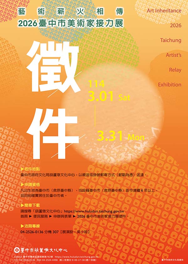 臺中市政府文化局為獎勵臺中市優秀藝術創作人才,激勵美術研究及創作風氣,提昇美術水準,充分落實藝文深耕理念,促進文化藝術薪火相傳,舉辦「藝術薪火相傳─2026臺中市美術家接力展」徵件。展出地點為臺中市葫蘆墩文化中心,入選者須配合臺中市政府文化局排定的2026年檔期,須提供一件作品由主辦單位列入館藏或典藏,符合以下兩項資格之一者,每人以展出一次為原則。