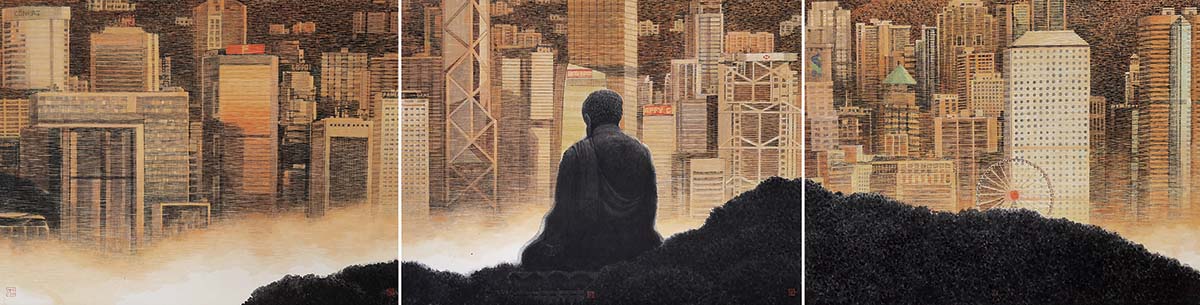 前面提到黃孝逵對香港都會地景有獨到的描繪手法,精準而鮮活地抓取在地風土特質,特別是地景外貌。2018年、2019年的〈維港紅帆〉與〈樓外樓〉描繪高樓夜景,鱗次而筆直的水泥森林在他的安排之下呈現如音樂般的節奏與詩意的韻致,雖不見筆墨線條,以間隙的流動取而代之,明暗相間如閃爍燈光,表現出港都夜色的明媚。〈獅山入夢〉描繪香港名勝獅子山,以純粹黑白構成山形,黑獅山上、白雲托襯下,隱約形成陰陽道教符號。傳說中,香港九龍為患,天上派神獅鎮壓,具在地文化象徵。藝術家擅長在大幅畫面角落畫龍點睛,右上角可見淺棕橘色的高樓大廈,傳統與現代並置,柔和與剛硬混雜,乃香港地景的典型,而他則以非典型方式呈現這種反差,既和諧又衝突。他對台灣的風景也有獨到的觀察與表現,〈太魯閣〉描寫土石流和山林並存的圖地關係,呈現的反而是一種「對照的和諧與節奏感」,一明一暗,猶如音樂中的對位法(Counterpoint)。黃孝逵在構圖規畫上的確獨具細膩與匠心,訪問中他也表達出現代與傳統並蓄、在地與跨域兼容的觀點:「香港要中西文化交流,就一定要有些非常傳統的,一定要具體的、實在的,亦可以是從傳統的基礎上加入西方理念的轉化。」