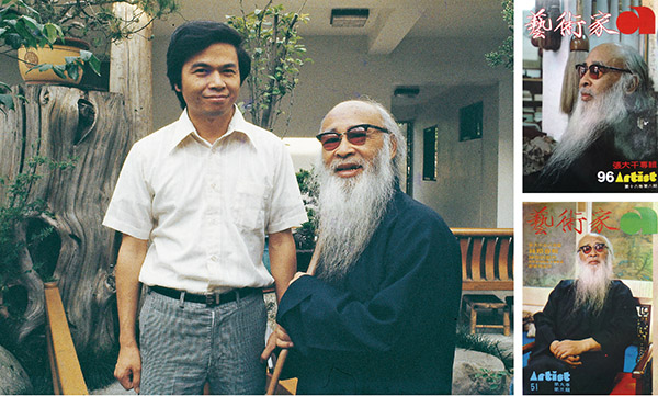 張大千在摩耶精舍與何政廣合影,《藝術家》雜誌兩次以張大千照片為封面