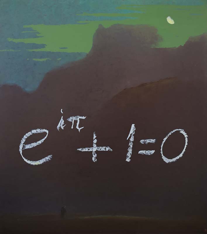 葉老師是一位感性的藝術家,也是一位理性的數學教育家,曾任教高中數學30年。2017年三月裡的一個清晨,葉老師從夢中醒來,突然閃現一個念頭:把歐拉公式eiπ + 1 = 0寫在那幅舊畫上吧!這是一個來自內心之聲,無聲之聲!於是他搬出一幅舊作,拿起顏料筆大膽的直接在畫面上寫下eiπ + 1 = 0。畫,就如此而成了。