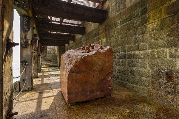 多蘿西.克羅斯〈紅色漂礫〉安置於福克斯通港灣突堤(Folkestone Harbour Arm)階梯下方,