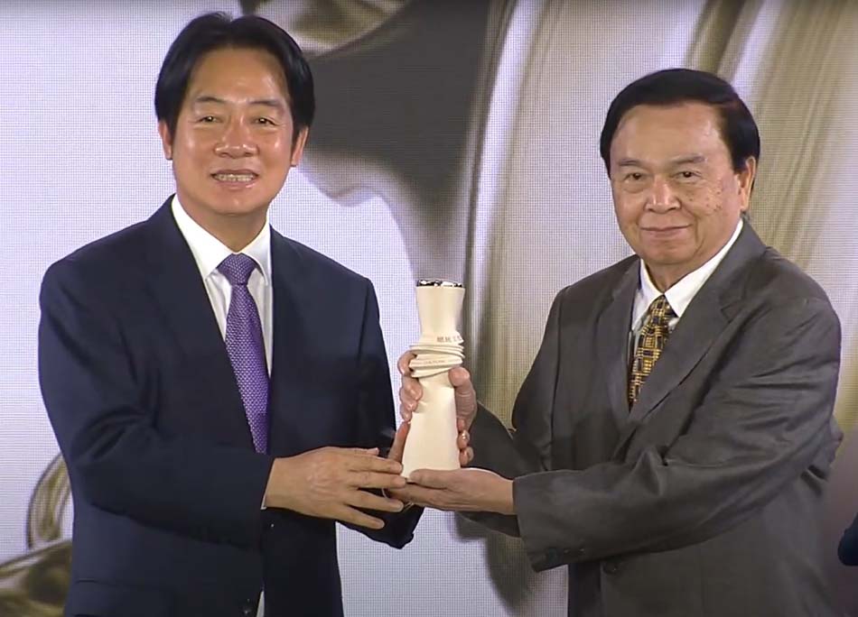 頒獎人總統賴清德與受獎人藝術家雜誌社發行人何政廣於典禮現場進行獎座頒發儀式