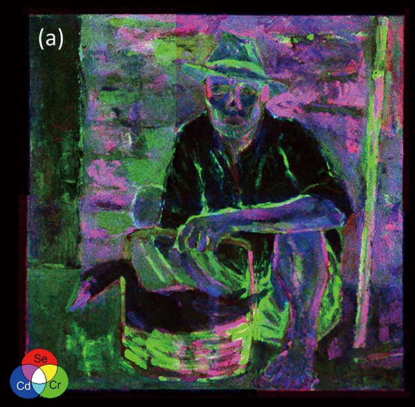 席德進1956年作品〈賣鵝者〉X射線螢光光譜分析中鎘、硒、鉻元素的分布重疊示意位置。