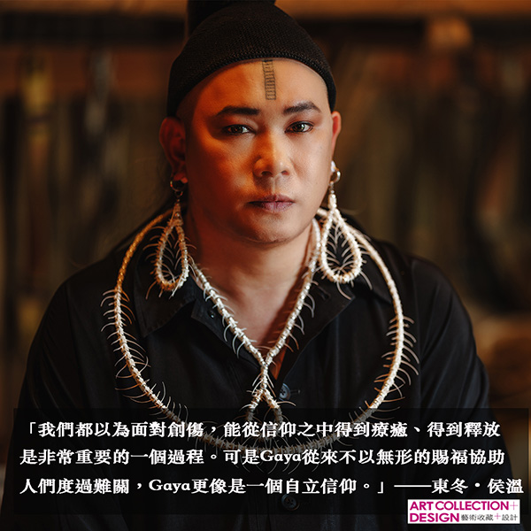 太魯閣族藝術家東冬.侯溫(Dondon Houmwm)出生、成長於花蓮銅門部落(Donmong),他創立「兒路創作藝術工寮」,並長年透過創作、策展與藝術行動深耕部落。近年,他以藝術為方法,投入研究、實踐、倡議「Gaya」——流動於泛紋面族群信仰與文化生命、牽動身分認同與倫理秩序,涵蓋人與人、與自然、與靈之間關係的深層法則。他說:「當代藝術是我的工具、我的巫具;創作,就是我的儀式。」東冬.侯溫將Gaya的靈觀拓展至性別、生態、經濟、土地資源等日常議題,從多重向度建立論述,增進族群之間的對話能量。而當更多人能將Gaya論述帶出部落,跨越文化與國度的藩籬,古老智慧也在當代社會中持續生長,於布滿傷痕的土地與人類身上,化生成長與和解的靈力。