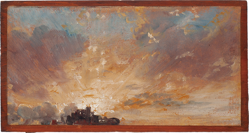 康斯塔伯則採取完全不同的路徑。他堅持戶外寫生與運用油彩現場創作,對自然的觀察帶有科學嚴謹性。在1820至1823年間,康斯塔伯進行了「雲彩研究」,創作數十幅雲彩速寫,每幅作品背後都精確標註時間、方向與氣象條件。康斯塔伯深信天空不僅是背景,而是作品的情感與意義核心。展覽中展示他寫生使用的攜帶式折疊椅和畫具。為了能在變化莫測的天氣下作畫,他也會使用已經調製好的顏料,而非需要花時間調和的粉末顏料。康斯塔伯對環境的真實體驗與泰納對自然磅礴的想像力形成明顯的對比。
