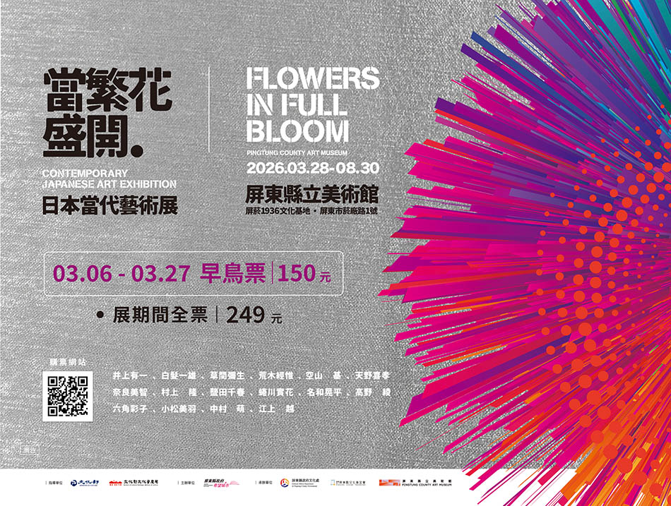 「當繁花盛開——日本當代藝術展」從全球當代藝術領銜者的經典,到新生代創作者的靈魂語彙,展開日本藝術從戰後至今的演變與對話,透過空間配置與展示節奏,引領觀眾感受日本當代藝術的多元樣貌。展覽自2026年3月28日起至8月30日止,於屏東縣立美術館展出,可於線上或現場購票,早鳥票將於3月6日起至3月27日於線上販售,限時優惠價150元;展期間全票249元。誠摯邀請您蒞臨本展,走入歷史與當代交織的空間,親身探尋日本當代藝術在歷史傳承與變革中盛放的多元姿態,感受南方藝文所綻放的文化能量。
