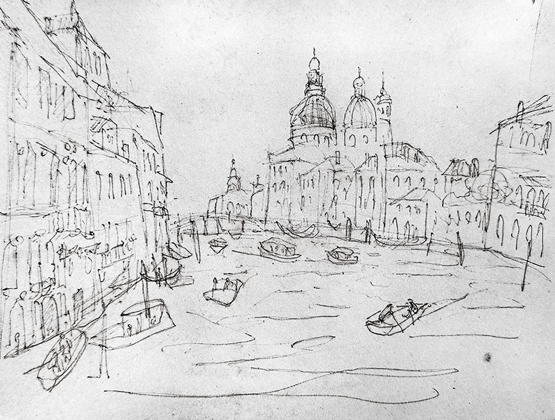 廖繼春創作這些畫,是在他於1962年6月應美國國務院邀請訪問美國四個月後赴歐遊歷,於1962年12月初到威尼斯。他在威尼斯大運河上的學院橋(Ponte dell' Accademia)上俯視河上景致,畫了鉛筆速寫。1962年12月返台後到1973年間,同一威尼斯風景畫了十一幅之多。1995年6月威尼斯國際藝術雙年展一百週年之際,我前往參加開幕式,當時我特地走到這座木造的學院橋上、廖先生作速寫的地點,拍下他所描繪的威尼斯大運河景色。(全文閱讀611期藝術家雜誌)
