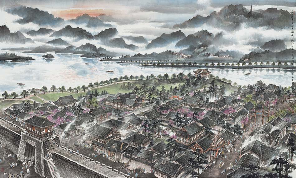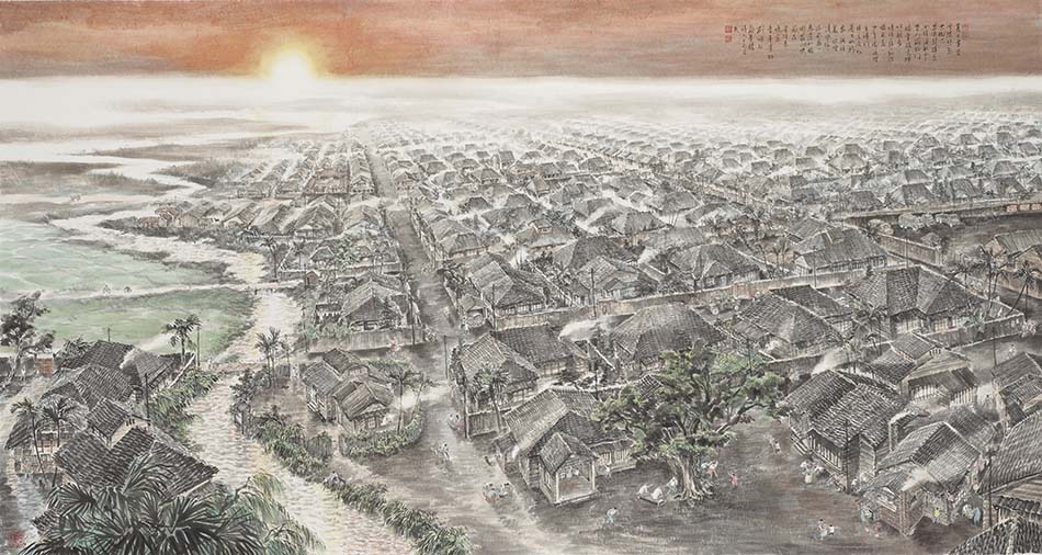 此外,〈古城春暖〉亦極具象徵性。劉墉以浙江臨安為創作背景,結合南宋古城史料與個人想像,構築出一處既真實又虛構的空間場域。八尺大畫之中,數百人物與繁複場景彼此穿梭,使其成為可觀、可遊,亦可寄託情感的精神地景,流露出畫家對文化根源和家國記憶的深層追尋。