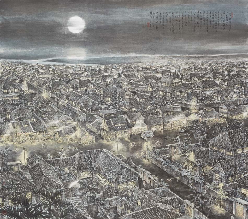 月夜題材,無疑是劉墉最具辨識度的視覺語言之一。他偏愛描繪夜色下的燈火和人影,在朦朧光影中營造真實又夢幻的氛圍。正如他所言:「我愛畫月夜,因為可以表現迷離的燈火與『驀然回首』的驚喜。」這種帶有距離感及情感溫度的觀看視角,使作品在寫實之外,彷彿始終籠上一層詩意的薄紗。