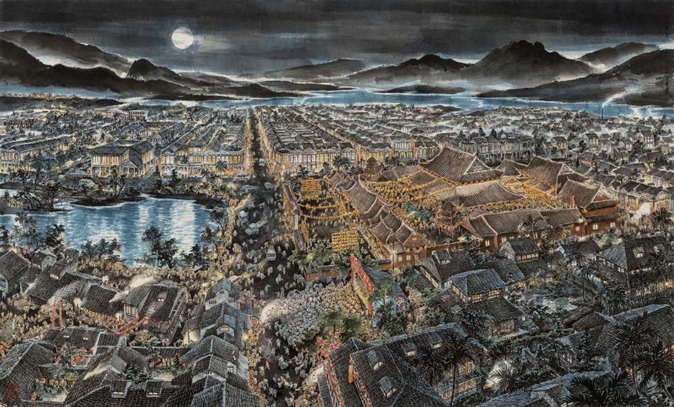 例如〈龍山寺慶元宵〉一作即描繪台北艋舺節慶時的熱鬧盛況,畫中人物多達一千兩百人,構成壯觀而震撼的視覺效果。此畫作呈現的卻不是現實場景的真實寫照,而是將童年印象、歷史考據與藝術想像融為一體,使古今時間在同一畫面中交疊,形成介於現實與記憶之間的文化景觀。