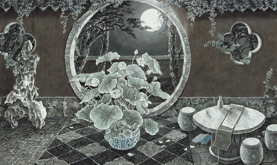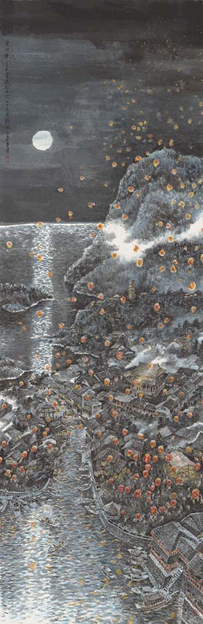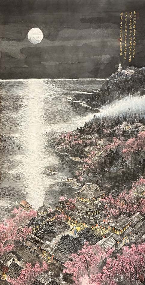 同樣屬於這一脈絡的〈春江花月夜〉取意於張若虛名篇〈春江花月夜〉,不僅止於詩境再現,而是構建成一幅可行、可遊、可讀的生活圖景。畫中自市井至樓閣,由庭院至江天,人物活動層層展開:洗衣、賞花、迎賓、飲宴,乃至角落裡帶點幽默意味的日常片段記憶,使詩意真正落入人間。遠處江海相接,明月隨潮升起;近處則是燈火與人情交織,將詩的空靈轉換為溫潤繁盛的節慶景象。