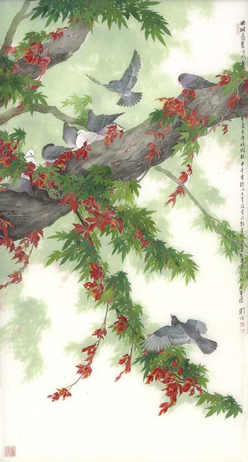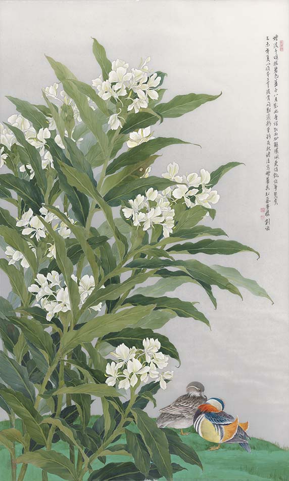 除了大場面的鋪排之外,劉墉在花鳥走獸題材中也展現出高度的文學性與象徵意涵。例如〈月夜潛行〉中,木蓮盛放於月光之下,樹枝上的貓頭鷹與潛行而至的雲豹形成張力十足的對峙,靜謐之中暗藏危機,隱喻「螳螂捕蟬,黃雀在後」的人生哲理;而〈珊瑚翡翠舞秋風〉、〈更隨甄宓夢鴛鴦〉與〈和平之春〉則由寫生出發,透過精湛的沒骨花卉技法,體現其「觀物精微、體物有情、移情入物、物我兩忘」的藝術境界。