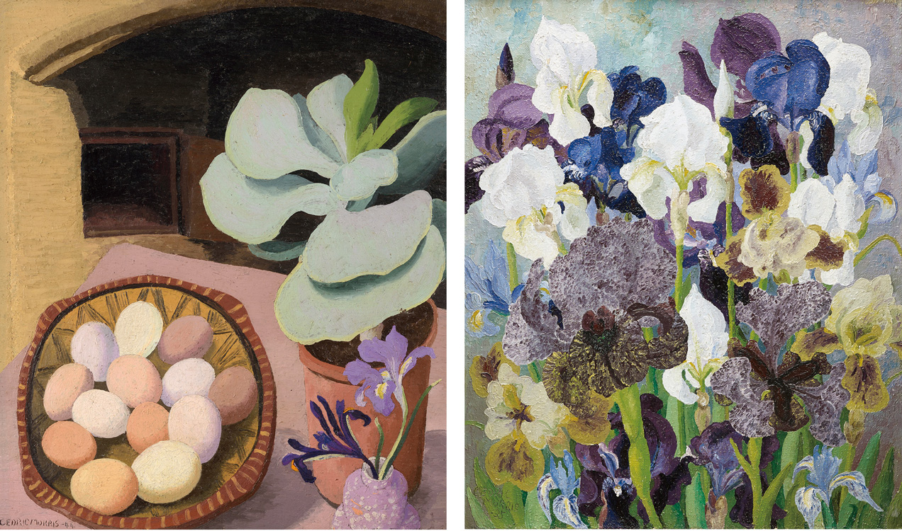 左圖 西崔克.莫里斯作品〈子葉與雞蛋〉 Sir Cedric Morris, Cotyledon and Eggs, Oil on canvas, 1944© Colchester Art Society. Courtesy the Cedric Morris Estate; 右圖 西崔克.莫里斯作品〈五月綻放的鳶尾花二號〉 Sir Cedric Morris, May Flowering Irises No. 2, Oil on canvas, 1935© Philip Mould & Company. Courtesy the Cedric Morris Estate