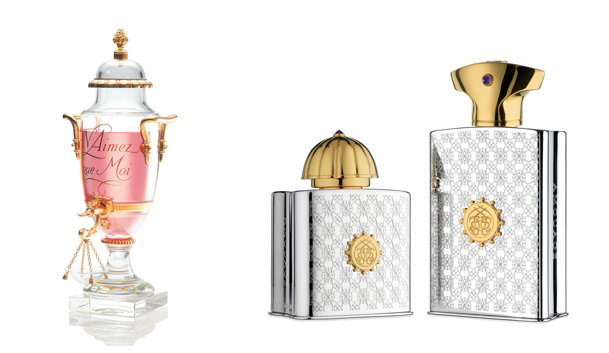 右.愛慕頂級限量金耀銀光收藏版,由英國倫敦梅菲爾區銀飾工坊的工藝師手工打造。優雅的緹花裝飾於簡約的925純銀瓶身,純銀鍍22K黃金的瓶蓋以北極光為靈感,鑲嵌閃耀神祕光芒的紫水晶寶石點綴。