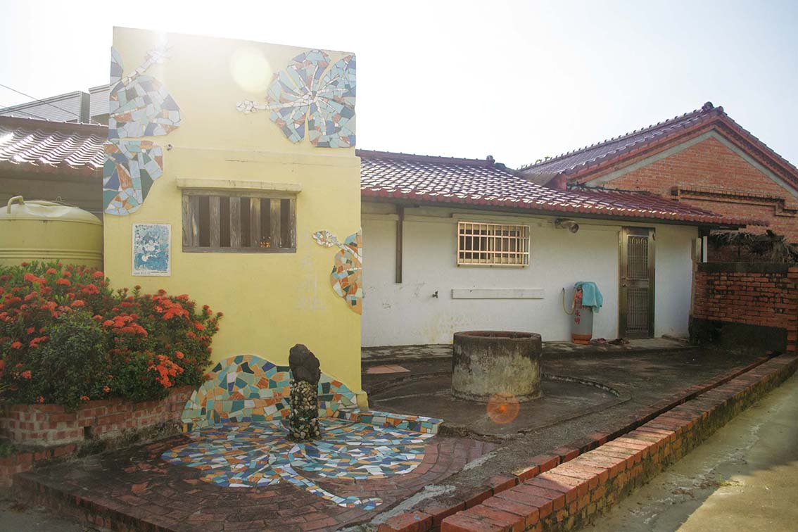 扶桑花圖案的馬賽克拼貼,旁邊是古井。(攝影:陳沛妤)