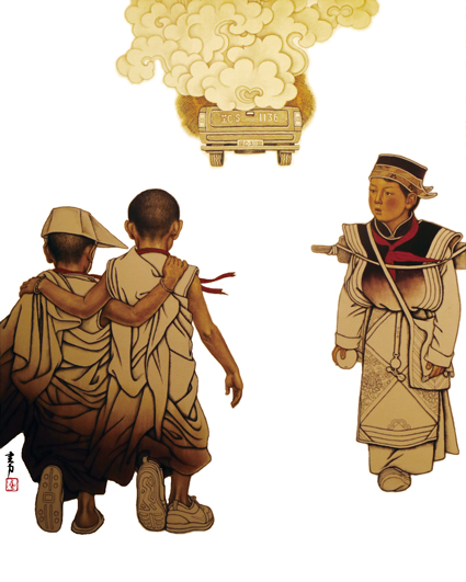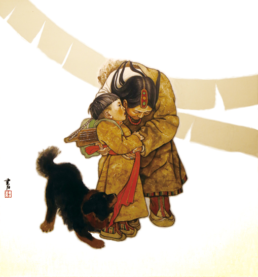 題為〈上學啦〉的作品,體現母親在給剛入小學的孩子繫紅腰帶,新生開學的第一天,孩子興奮地向母親耳語,說著悄悄話,母子深情無間的溫暖流入了觀眾的心田;同樣把關注的焦點放在學齡兒童教育上的作品〈路〉──畫面上一位全身著工布服飾的少年迎面走來,抖動的紅領巾格外奪目,路遇兩位童僧,配戴著拜師歸來獲得的紅色金剛結,興致衝衝,遠處疾馳而去的汽車背影為〈路〉再次點題,可謂匠心獨具。