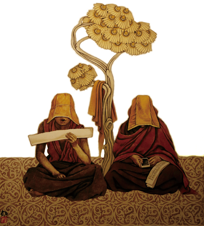 當代新西藏的發展日新月異,新文化審美的多樣性無不影響著藏民族的衣食住行,崇高至上的美學價值所蘊含的哲理通過畫面的每一個細節,潛移默化地滲透於觀者心間,通俗、簡潔,讓人過目留有餘香。在有限的展覽空間中,許多作品前總是聚集著不少年輕人,特別是前來恭賀畫展的唐卡畫師們,圍在藏族畫家巴瑪扎西周圍,聽他用藏語為大家講述畫中的故事,以及解析藝術手法的應用之道。或許,這正是韓書力在拉薩舉辦畫展的初衷:讓當代西藏繪畫的美學意義走入人群。