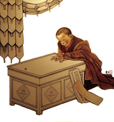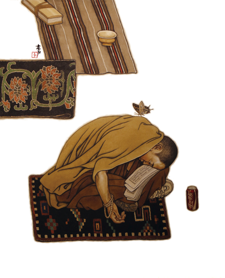 另一組作品主題旨在描繪當代寺院年輕僧人的日常生活,這也是韓書力進藏45年一直樂此不疲的選材。〈童心〉、〈菩提樹下〉、〈夢蝶〉都從不同的視角,一反過往對寺院生活極具哲理象徵意味的描述語言,深度走進年少僧眾生活的心理成長過程,選擇了鮮為人知的寺院生活中意趣盎然的一面,向觀眾傳遞了僧俗之間存在著同樣情感互動的親和力。