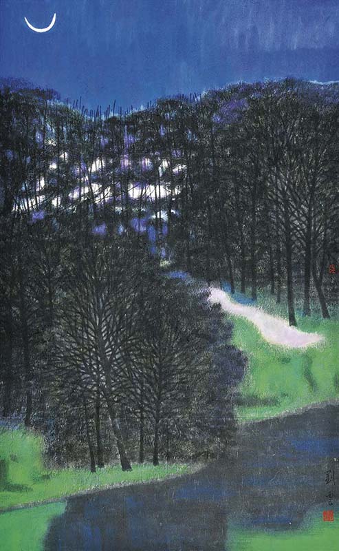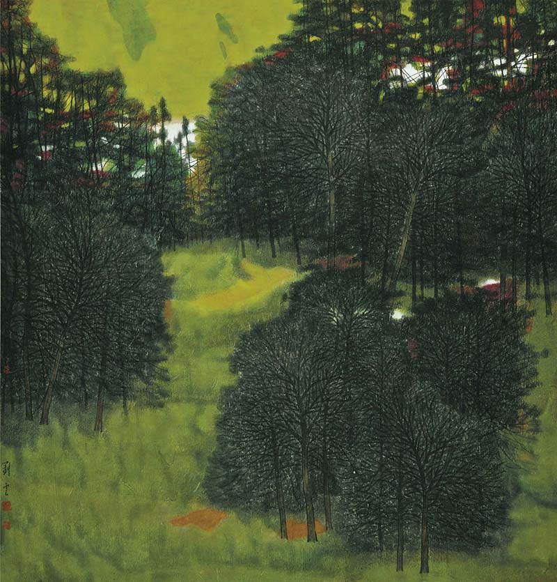 從事山水畫創作,繞不開筆墨問題。筆墨一般包含兩層內容:共同規範和個性特點。共同規範即我們通常說的「法」,是在歷史長河中逐漸形成的,藝術家要熟悉它、掌握它,但不能被現成的法束縛住,藝術家要在「有法」與「無法」之間顯示自己的才賦,也就是從「有法」到「無法」,建立自己的有個性特色的新法。劉雲尊重傳統的筆墨法則,但他沒有走摹仿傳統大師筆墨的道路,而是通過意臨和揣摩的方法學習傳統筆墨,並在實踐過程中摸索自己的筆墨路數。從文人畫的角度看劉雲的畫,他較少用一波三折的曲線,他用細線、直線較多。在他的作品中,墨與彩並重,甚至有時用彩勝過用墨,並用彩墨變化造成的層次與肌理來加強畫面的表現力。他注意畫面上黑白、虛實關係的轉換,同時重視光與空氣的表現。在他那裡,細緻的用筆不顯瑣碎,因為它們服務於畫面的整體效果。