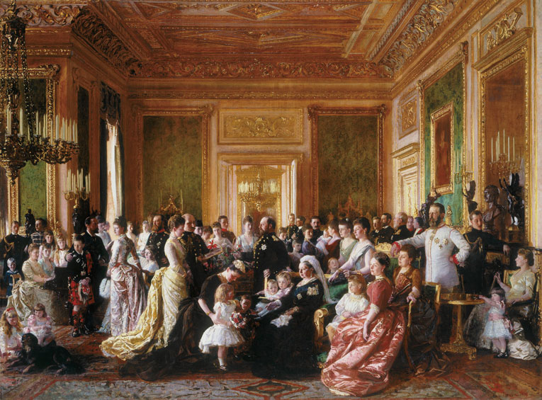 展場有一張勞瑞茲.圖森橫式的巨畫〈於1887年,維多利亞女王全家人〉,為女王在位50週年(金禧)而畫,裡面全是女王的家人,她跟阿爾伯特親王相愛結婚,生下九個小孩,有42個孫子女與142個曾孫子女,可說子孫滿堂;不僅如此,在位期間,大英帝國處於強盛,她也受人民愛戴,是各國景仰的女王。據說維多利亞女王之前看過丹麥國王克里斯蒂安九世(Christian IX of Denmark)的家人肖像,喜愛的不得了,一探知,是圖森所畫的,就在金禧之年,好不容易她與家人集聚一堂,也特別請此畫家為全家人繪製群像畫,人物姿態相當優雅、自然,一點不矯揉做作,同時又能展現帝國的輝煌與皇室的傲氣。