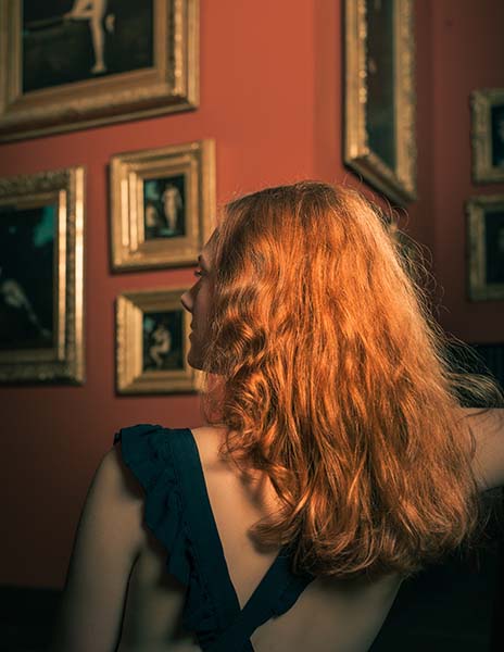 人們所稱的「紅髮」並非真正的紅色,而是一有著多種變化、難以定義的顏色,它有相當飽和的彩度,並帶著十分特殊的光澤,在眾多髮色中格外引人注目。但是,對於畫家而言,這個顏色並不容易捕捉,除了因為它微捲的蓬鬆感難以用輪廓線框住,髮絲的表面也像是絲綢又似金屬的反光與層次變化。