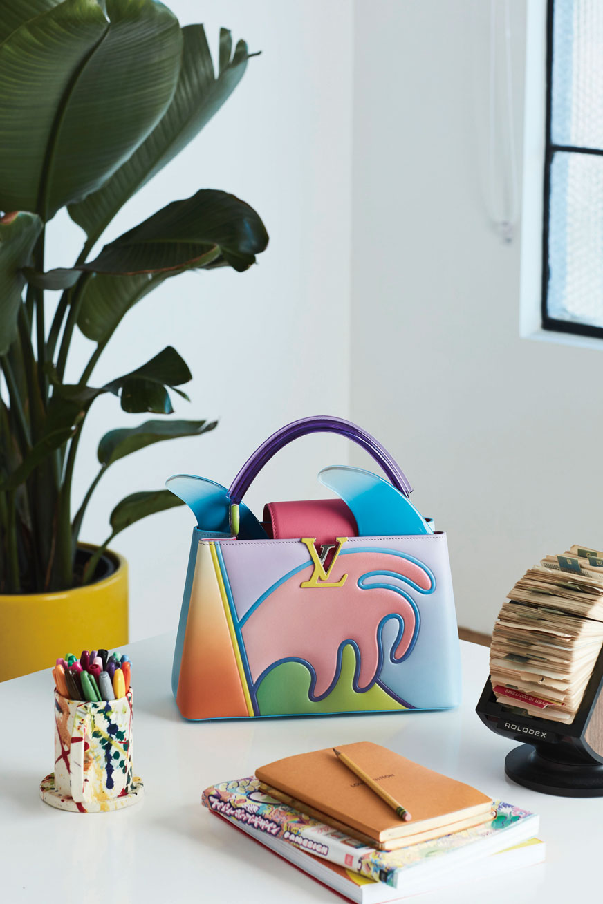 「對我而言重要之處在於,手袋應體現出我繪畫的真實性、洛杉磯的生活質地與衝浪文化,但它更具雕塑性,在視覺上更為柔滑,看來具有類似潛水衣的質感。我為手袋加上了衝浪板元素以完善我的創作世界的感覺,在造型輪廓上增加了一對鰭。鰭片還具有功能:一是鏡子,另一是梳子,它們是可移動的。使用者可以根據當天的感受來決定手袋的外觀,觸摸它並感受其紋理,也是使用過程的一部分。我在手袋裡添加了最後一個元素:我的自畫像,如同一個祕密簽名。」