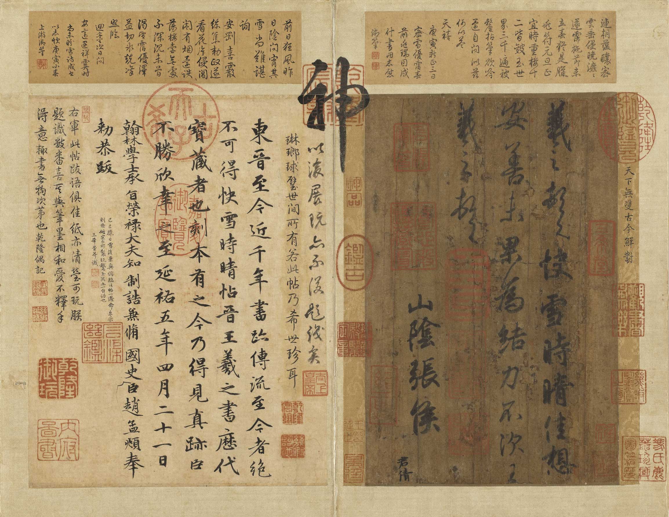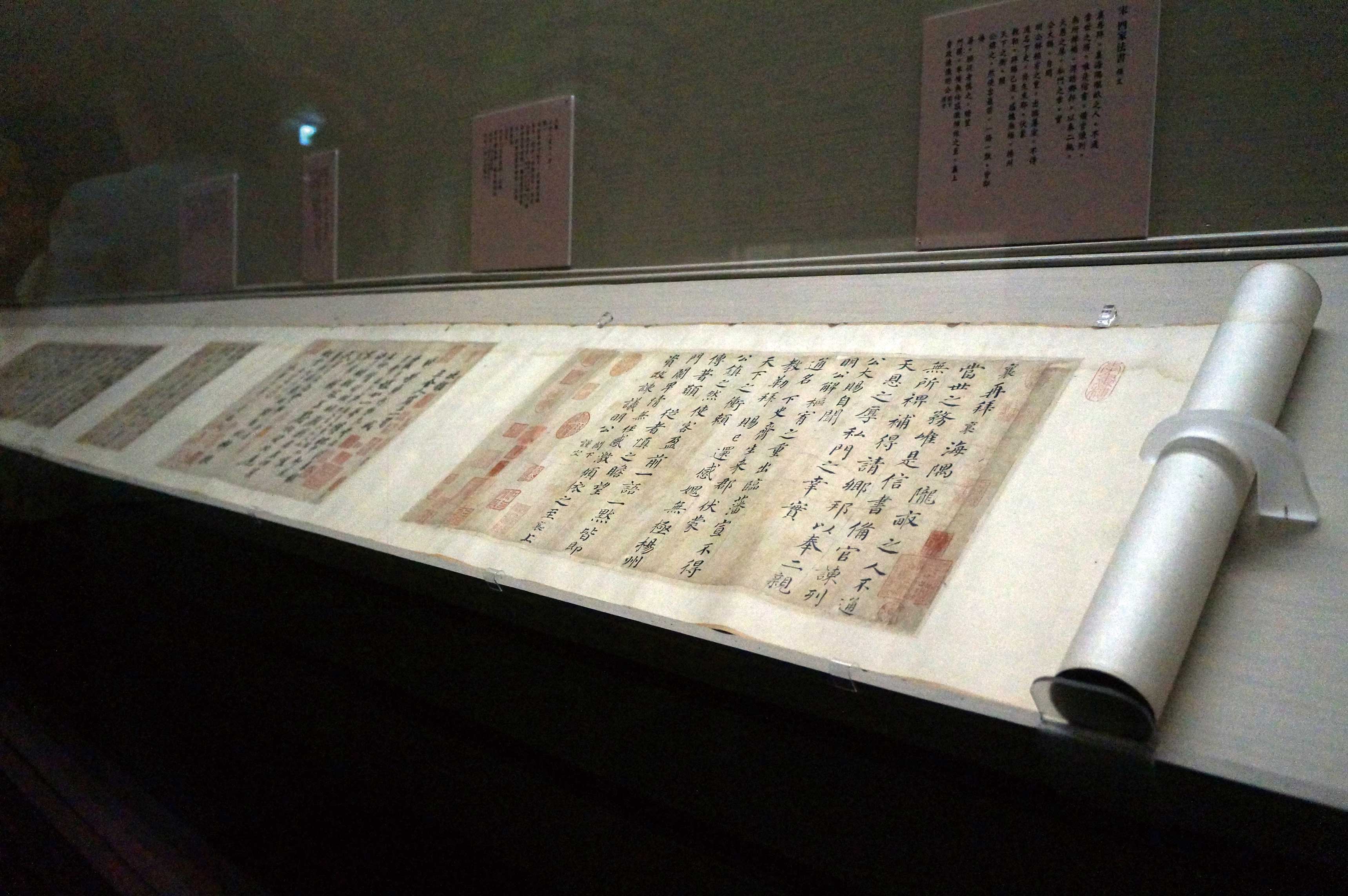 在書法展品方面,首推王羲之〈快雪時晴帖〉與〈遠宦帖〉,兩作充分展現出書聖行書與草書的丰神。〈宋四家法書〉、〈徽宗詩帖〉,則分別代表了北宋士大夫與帝王的書法品味。其他如南宋陸游、朱熹,元代趙孟頫的尺牘,均能引領我們領略文人相互間情感與理性的交會。此外,添附在作品後的題跋書法也頗有可觀,與作品本身兩相參照,書史梗概已在其中。