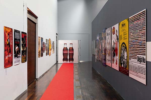 「馬蒂厄.勞雷特:衍生回顧展(1993-2023)」展場一景。紅毯盡頭立著2支與真人同高可口可樂汽水瓶廣告看板,細看上面的logo文字不是「Coca Cola」,而是他的名字「Matthieu Laurette」。