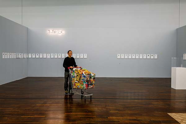 中:馬蒂厄.勞雷特 免費之王 2001 等身尺寸超寫實雕塑:蠟、玻璃纖維、乳膠、樹脂、天然頭髮、訂製眼義肢、衣服、鞋子、油漆、裝滿100%退款產品的超市購物車 於「馬蒂厄.勞雷特:衍生回顧展(1993-2023)」展場一景