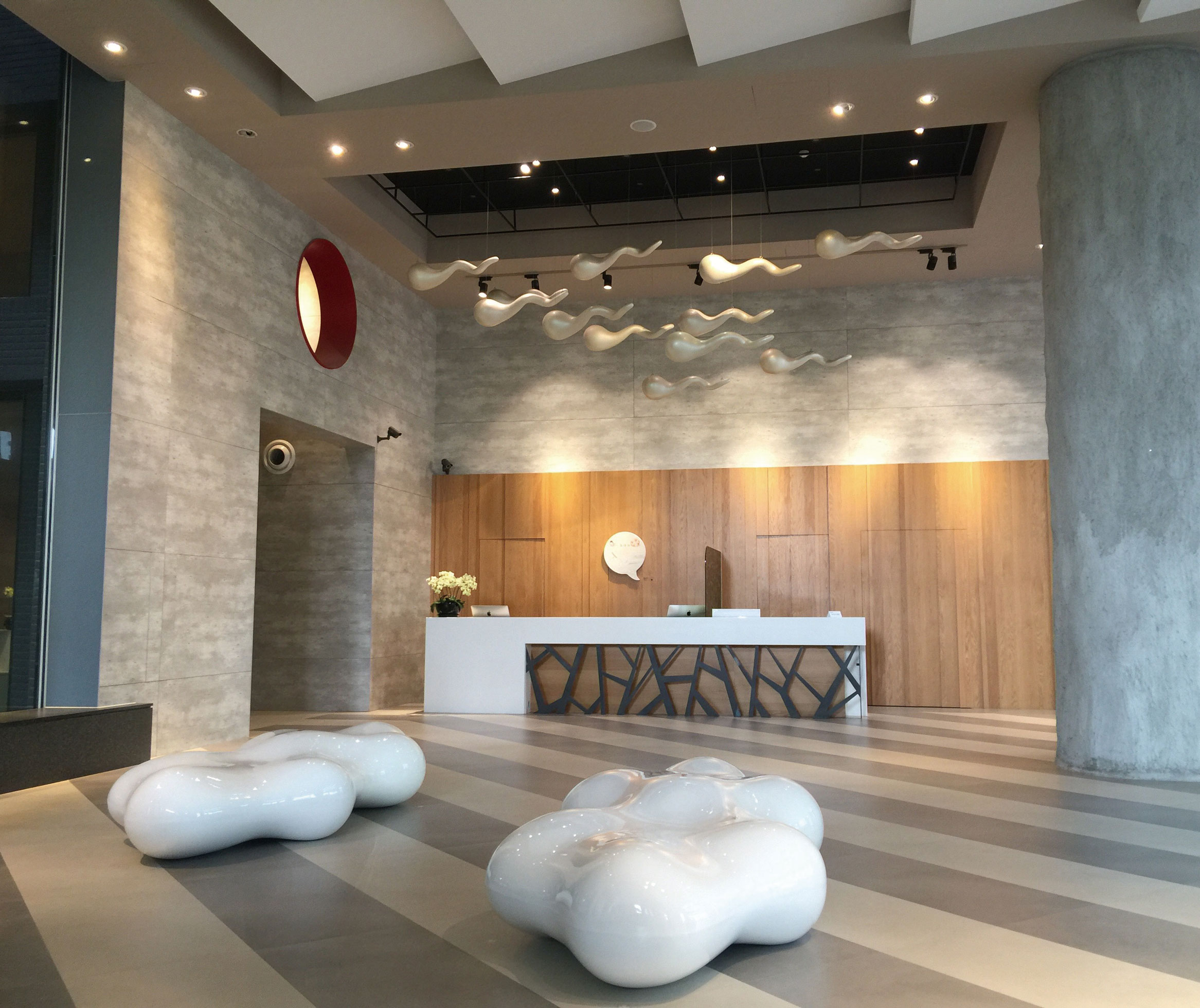 「我大概總共擁有200到300件左右的藝術品,但目前為止最讓最自豪的收藏,應該就是『送子鳥生殖中心』所在的這棟建築。」賴興華說,十多年前,原本位於新竹東門街的診所空間,就邀請了菲律賓的華僑藝術家與建築師Francis Yeh擔綱室內設計,因為喜歡他明亮、溫暖而無壓力的空間風格;後來計畫興建新大樓時,便再度委任Francis Yeh設計整幢建築。「『生命之樹』是整體建築物的主題,我們用這個元素來串連所有空間,呼應著生殖中心創造生命的功能。」賴興華解釋,這棟建築的造型以女性的子宮為發想,應該是地表上最大的人造子宮——在建築物門口的兩側就有兩個水池,上面漂浮著大小不一的圓形光球,象徵著孕育卵泡的卵巢;而走進室內的接待大廳,包覆狀的空間則是孕育生命的子宮腔,前方挑高的天花板處則懸吊著有如蝌蚪般游動的精子造型雕塑。「〈生命之樹〉(The Tree of Life)其實是奧地利藝術家克林姆(Gustav Klimt)為比利時的斯托克雷特宮所創作的壁畫作品,畫面左側的『期待』是一個望向遠方的女子,而右側的『履行』則是一對擁抱的男女。我很喜歡這件作品,覺得整個畫面很能反映出女性的心願:找到愛情的歸宿,然後成家生子。〈生命之樹〉反映了我的事業,也就是創造生命。」有了這樣的想法,賴興華便和建築師進行討論,而Francis Yeh認為,新的建築對於「送子鳥」來說也意味著事業的再生,因此更進一步地建議納入更多符合這個意義的主題作品。