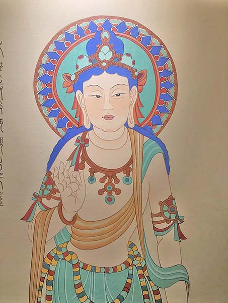 人物作品中,他的〈持淨瓶觀音〉雖然臨仿自大千居士的白描稿本,然而畫家所表現的觀音圖,畫面極為平靜典雅,勾線、敷色、描摹等一筆不苟,絲紋不亂,層層敷染醇厚,華麗的色彩,強化了畫面的視覺效果,通幅呈現出觀音大士悲天憫人、溫柔慈祥的形象!