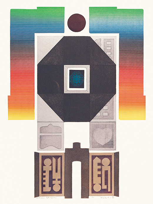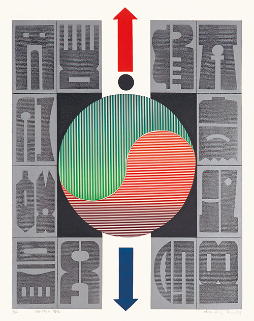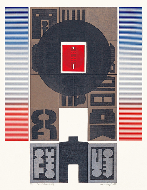 大學畢業之後,廖修平轉往東京教育大學學習油畫,之後負笈法國,向那比派的畫家夏士德學習油畫,同時又進入知名版畫家威廉.海特的十七號版畫工作室進修。在海外創作逐漸成功之際,他開始思考與文化根源呼應的創作新形式,終究在版畫上找到發揮的天地,廟門符號成為重要的主題。